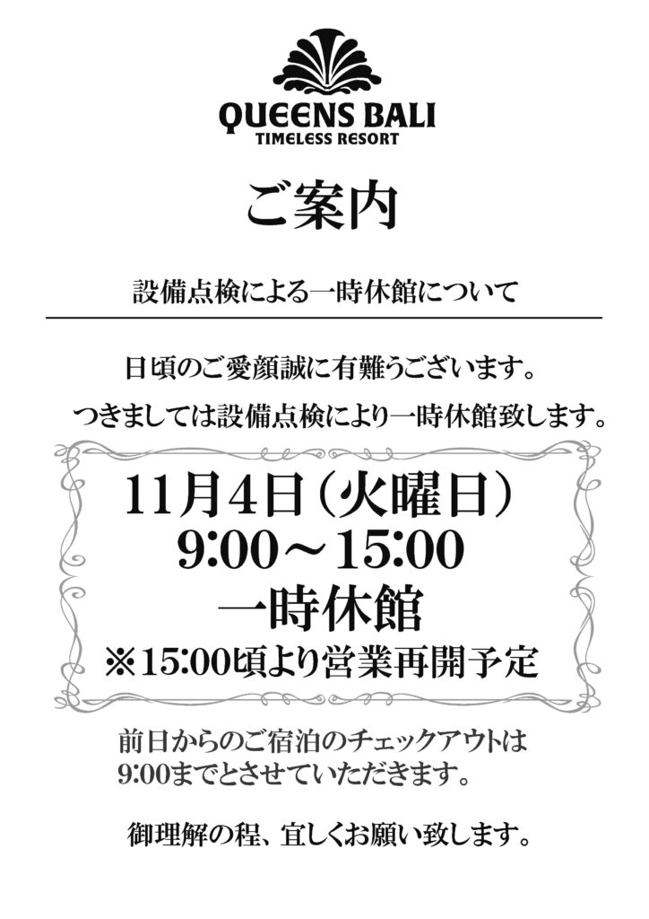 11月4日は設備点検の為、一時的に休館とさせて頂きます。