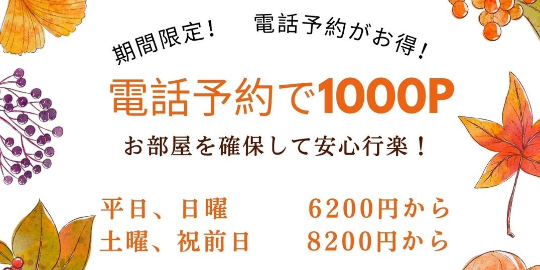 前日までに電話予約で、チェックアウト後もれなく1000Pプレゼント!